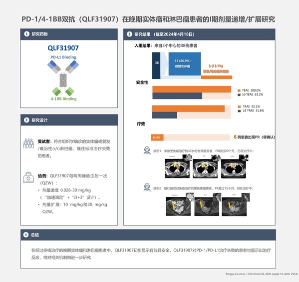 QLF31907由齊魯制藥自主研發(fā)。一方面通過阻斷PD-L1恢復(fù)TCR信號,另一方面通過與4-1BB結(jié)合,為T細(xì)胞活化提供共刺激信號,從而促進(jìn)T細(xì)胞的增殖、活化,產(chǎn)生顯著的抗腫瘤免疫作用。本次入選的研究為PD-1/4-1BB雙抗(QLF31907)在晚期實體瘤和淋巴瘤患者的I期劑量遞增/擴(kuò)展研究(摘要編號:2534),主要研究者為四川省腫瘤醫(yī)院林桐榆教授。