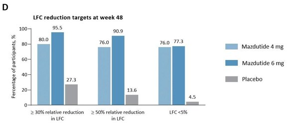 在GLORY-1研究(ClinicalTrial.gov:NCT05607680)中,共610例中國超重(BMI≥24 kg/m2)伴有至少一種體重相關(guān)合并癥或肥胖(BMI≥28 kg/m2)受試者按1:1:1隨機接受瑪仕度肽4 mg(N=203)、瑪仕度肽6 mg(N=202)或安慰劑(N=205)治療。共92例受試者在基線時通過MRI-PDFF法進行肝臟脂肪含量(LFC)評估,其中,69例受試者(瑪仕度肽4 mg組25例、瑪仕度肽6 mg組22例、安慰劑組22例)的基線LFC≥5%#且進行了48周LFC評估。