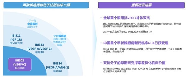 眼科領(lǐng)域,信達(dá)生物替妥尤單抗注射液(重組抗胰島素樣生長(zhǎng)因子1受體(IGF-1R)抗體,研發(fā)代號(hào):IBI311)的新藥上市申請(qǐng)已獲受理,用于甲狀腺眼?。═ED)的治療。替妥尤單抗是中國(guó)首個(gè)申報(bào)上市的IGF-1R抗體,作為具有創(chuàng)新作用機(jī)制的生物藥,有望填補(bǔ)國(guó)內(nèi)TED治療領(lǐng)域60年來(lái)無(wú)新藥可用的空白,滿足國(guó)內(nèi)TED治療的顯著臨床需求,為中國(guó)TED患者帶來(lái)有效、安全、可及的治療手段。IBI302 (VEGF/C)臨床3期研究啟動(dòng),治療新生血管性年齡相關(guān)性黃斑病變,長(zhǎng)間隔給藥有望實(shí)現(xiàn)優(yōu)異療效,潛在改善地圖樣萎縮。IBI324(VEGF-A/ANG-2)、IBI333(VEGF-C/VEGF-A)處于臨床1期研究階段,探索差異化臨床價(jià)值。