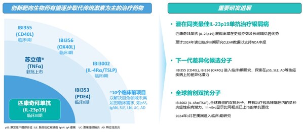 在自身免疫領(lǐng)域,信達(dá)生物成功上市一款產(chǎn)品——蘇立信®(阿達(dá)木單抗注射液),已獲批類風(fēng)濕關(guān)節(jié)炎、強(qiáng)直性脊柱炎、銀屑病等八項(xiàng)適應(yīng)癥并均納入國(guó)家醫(yī)保。信達(dá)生物自主研發(fā)的重組抗白介素23p19亞基(IL-23p19)抗體注射液匹康奇拜單抗(研發(fā)代號(hào):IBI112)在中國(guó)中重度斑塊狀銀屑病受試者中開(kāi)展的Ⅲ期臨床研究(CLEAR-1)中達(dá)成主要終點(diǎn)和所有關(guān)鍵次要終點(diǎn),是目前本靶點(diǎn)全球唯一一個(gè)首要研究終點(diǎn)(16周PASI90)突破80%的銀屑病三期注冊(cè)臨床研究,計(jì)劃遞交上市申請(qǐng)。IBI355(CD40L)、IBI356(OX40L)、IBI3002(IL-4Rα/TSLP)等特色創(chuàng)新性免疫分子進(jìn)入臨床,探索全球自免細(xì)分領(lǐng)域,包括原發(fā)性干燥綜合征(pSS)、系統(tǒng)性紅斑狼瘡(SLE)、特應(yīng)性皮炎(AD)、哮喘等疾病的未滿足臨床需求。