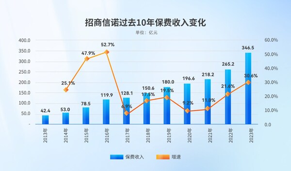 保費收入:2023年,招商信諾實現(xiàn)保費收入346.5億元,同比增長30.6%,排在了已披露壽險公司的第16位,在外資公司中位列第3位。過去10年,招商信諾保費收入持續(xù)保持穩(wěn)定增幅,長期價值逐步顯現(xiàn)。
