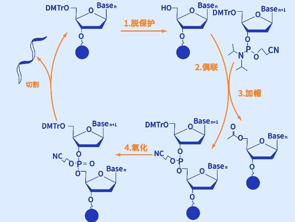 磷酰胺三酯合成法由脫保護(hù)、偶聯(lián)、加帽和氧化四步化學(xué)反應(yīng)組成循環(huán),在每個(gè)循環(huán)中,(1)脫保護(hù),通過(guò)酸處理去除新引入的核苷酸5'-羥基上的DMT保護(hù)基團(tuán),使其暴露出來(lái),為下一個(gè)核苷酸的連接做好準(zhǔn)備;(2)偶聯(lián),使用活化的磷酰胺三酯核苷酸與已固定在固相載體上的核苷酸鏈進(jìn)行化學(xué)偶聯(lián),形成磷酸二酯鍵,將新的核苷酸添加到鏈的3'端;(3)加帽,未偶聯(lián)的5'-羥基會(huì)被加帽以防止它們?cè)诤罄m(xù)循環(huán)中反應(yīng),確保只有偶聯(lián)成功的鏈繼續(xù)延長(zhǎng);(4)氧化,最后通過(guò)氧化劑將不穩(wěn)定的三價(jià)磷原子氧化為更穩(wěn)定的五價(jià)磷,從而使鏈上的磷酸二酯鍵得到鞏固。以此循環(huán),直到完成指定寡核苷酸序列的合成。