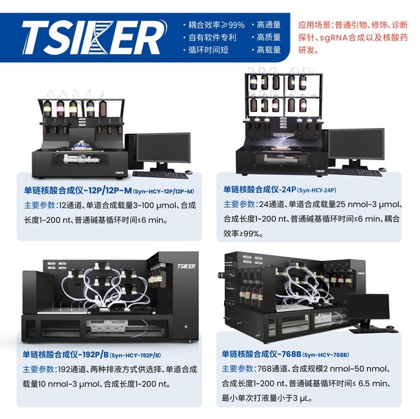 基于擎科生物多年的合成領(lǐng)域研究經(jīng)驗(yàn)以及原始數(shù)據(jù)累積分析,擁有高質(zhì)量、高載量、高通量3個(gè)技術(shù)平臺(tái),在2014年成功研制出單鏈核酸合成儀-192B,并在隨后的幾年開發(fā)出可應(yīng)用于不同領(lǐng)域具備差異化功能的產(chǎn)品系列:?jiǎn)捂満怂岷铣蓛x-12P、單鏈核酸合成儀-24P、單鏈核酸合成儀-192P/B、單鏈核酸合成儀-768B,并在2023年4月發(fā)布擎核TsiKer® 高載量合成儀。