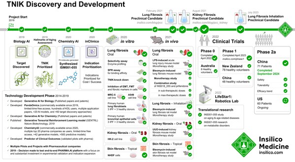 ISM001-055是一種靶向TNIK的潛在全球首創(chuàng)小分子抑制劑,開發(fā)過程由生成式AI賦能。在IPF中,激活TNIK靶點(diǎn)可驅(qū)動(dòng)肺部的病理性纖維化,導(dǎo)致肺功能進(jìn)行性下降。通過抑制TNIK信號傳導(dǎo),ISM001-055旨在阻止或逆轉(zhuǎn)纖維化過程,為IPF患者提供一種改善疾病的治療方法。2024年3月,英矽智能在Nature Biotechnology發(fā)布論文,講述該候選藥物的發(fā)現(xiàn)、設(shè)計(jì)與開發(fā)全流程,包括靶點(diǎn)發(fā)現(xiàn)、生成化學(xué)探索、多重體內(nèi)外實(shí)驗(yàn)驗(yàn)證,以及在健康志愿者中開展的I期臨床試驗(yàn)結(jié)果。2024年10月,ISM001-055藥物化學(xué)研發(fā)歷程登上 Journal of Medicinal Chemistry。同年6月。TNIK靶點(diǎn)在老齡化相關(guān)疾病中的應(yīng)用潛力在 Cell Trends in Pharmacological Sciences發(fā)表。