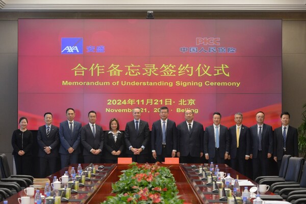 北京2024年11月29日 /美通社/ -- 近日,法國安盛集團(tuán)(AXA)與中國人民保險集團(tuán)股份有限公司(以下簡稱:人保集團(tuán))在北京人保集團(tuán)總部簽署了合作備忘錄。雙方將基于各自優(yōu)勢,通過采取創(chuàng)新合作交流模式,在全球范圍內(nèi)深入探索國際合作、產(chǎn)品研發(fā)、技術(shù)創(chuàng)新,共同促進(jìn)全球保險市場可持續(xù)健康發(fā)展。人保集團(tuán)總裁趙鵬、人保集團(tuán)副總裁兼人保財險總裁于澤、人保集團(tuán)副總裁才智偉、人保集團(tuán)合作部總經(jīng)理張海軍、人保集團(tuán)保險部總經(jīng)理彭鋼、人保再保險總裁張青, 安盛集團(tuán)首席執(zhí)行官托馬斯?布博 (Thomas Buberl)、安盛大中華區(qū)首席執(zhí)行官尹玄慧、安盛天平財產(chǎn)保險有限公司首席執(zhí)行官左偉豪、安盛天平總經(jīng)理助理曾翔、安盛天平總經(jīng)理助理兼總精算師殷兆男、安盛天平首席市場營銷官戴思遠(yuǎn)等多位嘉賓蒞臨簽約現(xiàn)場。