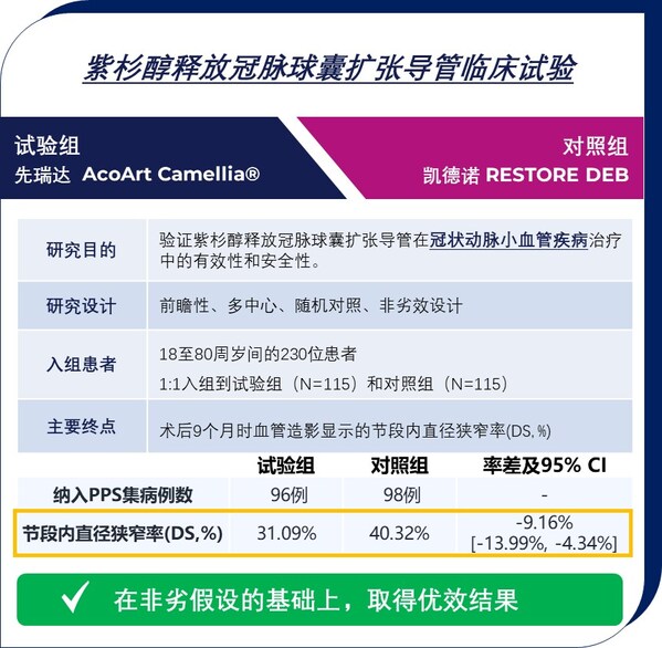 北京2024年12月4日 /美通社/ -- 2024年11月29日,先瑞達(dá)紫杉醇釋放冠脈球囊擴(kuò)張導(dǎo)管AcoArt Camellia®獲NMPA批準(zhǔn)上市,其適用于血管直徑≥2.0mm且≤2.75mm的原發(fā)冠狀動(dòng)脈血管病變的治療。
