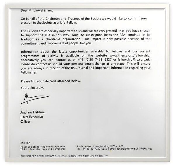 英國皇家學會工藝院成立于1754年,是英國歷史最悠久的學術機構之一,總部位于倫敦,是一個覆蓋自然科學、人文藝術、工業(yè)制造等眾多領域的皇家學術機構,在1847年被英國皇室授予憲章。其院士成員囊括了世界著名科學家、諾貝爾獎獲得者、人文藝術家以及國家政要,自成立268年以來,當選院士來自全球70余個國家,入選終身院士代表著在藝術、商業(yè)和社會科學領域所獲得的最高學術榮譽 ,像馬克思主義的創(chuàng)立者和哲學家卡爾?馬克思、噴氣式發(fā)動機發(fā)明人弗蘭克?惠特爾、經(jīng)濟學的主要創(chuàng)立者亞當?斯密等都曾是該機構的終身院士。