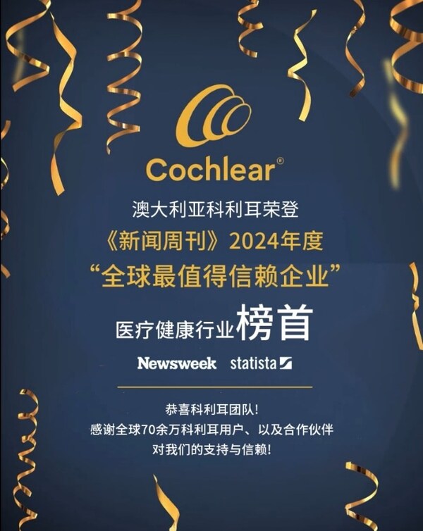 北京2025年3月21日 /美通社/ -- 科利耳宣布,在美國三大時事周刊之一《新聞周刊》(Newsweek)發(fā)布的2024年度“全球最值得信賴企業(yè)”榜單中,榮膺醫(yī)療健康行業(yè)榜首。其評選結(jié)果被視為跨國企業(yè)公信力評估的權(quán)威風(fēng)向標(biāo)。