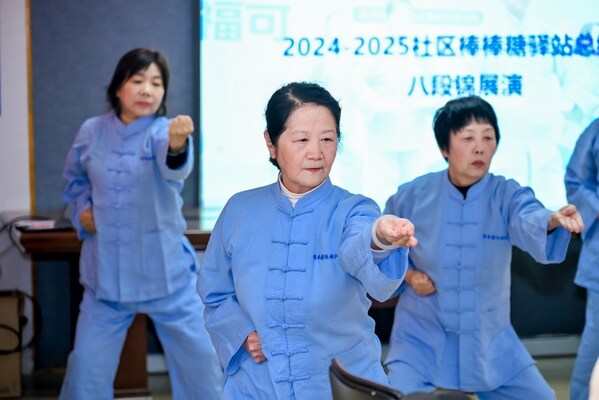 總結(jié)會上,棒棒糖運(yùn)動隊(duì)的八段錦展演成為活動的"高光時刻"。隊(duì)員們身著統(tǒng)一的藍(lán)色練功服,整齊劃一地演繹著傳統(tǒng)養(yǎng)生精髓,展示了他們幾個月來的鍛煉成果。在座談環(huán)節(jié),隊(duì)員們分享了自己的鍛煉心得,紛紛表示加入棒棒糖運(yùn)動隊(duì)后,不僅通過科學(xué)運(yùn)動血糖控制得更好,多項(xiàng)身體機(jī)能提高了,幸福感也得到顯著提升。他們對未來的活動充滿期待,希望得到來自社區(qū)以及改變糖尿病基金的更多支持。