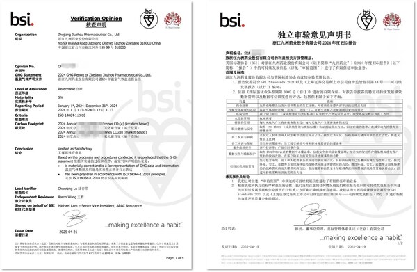 上海2025年4月23日 /美通社/ -- 近日,浙江九洲藥業(yè)股份有限公司(以下簡稱"九洲藥業(yè)")順利通過BSI核查,獲得BSI頒發(fā)的ISO 14064-1組織溫室氣體排放核查和ESG報(bào)告鑒證聲明。