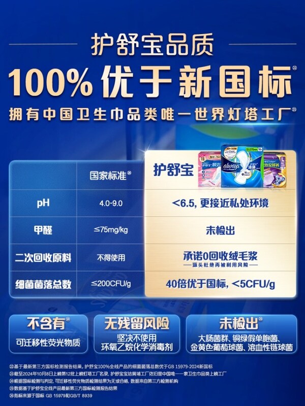 從"長度縮水"引發(fā)的信任危機(jī),到"熒光劑超標(biāo)"、 "pH值爭議"觸發(fā)的安全焦慮,衛(wèi)生巾行業(yè)的每一次公共討論,都展現(xiàn)了中國女性對"什么衛(wèi)生巾安全又好用"的關(guān)注和期望。新國標(biāo)的實(shí)施,標(biāo)志著行業(yè)監(jiān)管從"基礎(chǔ)安全"向"品質(zhì)健康"的跨越,呼應(yīng)了當(dāng)代女性對經(jīng)期護(hù)理"安全零妥協(xié)、體驗(yàn)更卓越"的雙重期待。一直以來,護(hù)舒寶持續(xù)倡導(dǎo)"科學(xué)護(hù)健康"理念,致力于以"材料頂配、研發(fā)頂配、生產(chǎn)頂配"的高質(zhì)量產(chǎn)品科學(xué)守護(hù)每個女性的經(jīng)期健康與舒適。同時,護(hù)舒寶積極響應(yīng)"健康中國2030" 行動號召,進(jìn)一步加強(qiáng)科普力度,科學(xué)守護(hù)女性經(jīng)期健康舒適。未來,護(hù)舒寶將持續(xù)以科研之力踐行守護(hù)女性健康的承諾,用匠心品質(zhì)詮釋舒適真諦,讓每一次標(biāo)準(zhǔn)升級,都成為女性邁向更自由、更舒適、更自信生活的階梯。