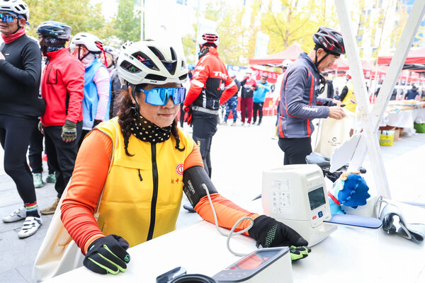 活動(dòng)當(dāng)天,通明湖畔秋色宜人,在互動(dòng)區(qū)的歐姆龍健康體驗(yàn)展臺(tái)前,多款智能健康產(chǎn)品有序陳列,吸引市民與騎友駐足體驗(yàn)及咨詢交流。一旁的趣味互動(dòng)區(qū)與主題打卡墻成為人氣焦點(diǎn),騎友們?cè)诖硕ǜ窕盍λ查g,讓健康理念在輕松的氛圍中自然傳遞。